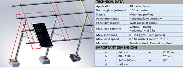 The system is suitable for all flat ground. The system has great placement flexibility and amazing adjustment capabilities. The system is very easy to assemble and the “Click” system makes the mounting of the panels very easy and simple. The construction