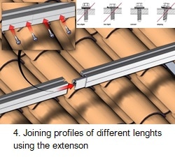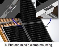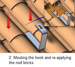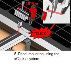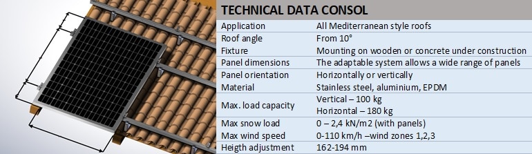 The system is suitable for all Mediterranean roofs with mounting on wooden or concrete under construction. It gives great positioning flexibility of the panels, because layout depends only on the positions of the hooks and “Click” system clamps. The main advantages are a small number of parts and very efficient cooling. The construction is wind and snow resistant.